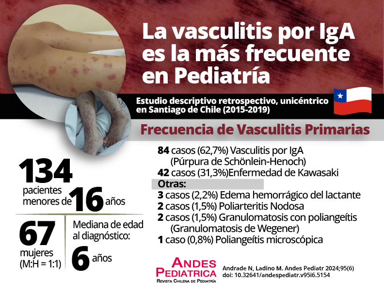 Pacientes y Método: Estudio retrospectivo que incluyó a pacientes con diagnóstico de vasculitis primaria menores de 16 años, atendidos en un consultorio de Reumatología Pediátrica de un hospital terciario en Santiago de Chile, entre enero del 2015 y diciembre del 2019. La recolección de datos se obtuvo a partir de las fichas clínicas y registro informático. Los diagnósticos fueron: Vasculitis IgA (Púrpura de Schönlein Henoch), Edema hemorrágico del lactante, Enfermedad de Kawasaki (EK), Poliarteritis nodosa (PAN), Granulomatosis con poliangeitis (GPA) y Poliangeítis Microscópica (PAM). No se encontraron casos de Poliangeítis Granulomatosa eosinofílica ni Arteritis de Takayasu en esta muestra. Las variables analizadas fueron: características demográficas, manifestaciones clínicas, laboratorio, imágenes, biopsias, tratamientos y evolución.